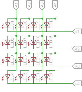 ダイナミック点灯は、LEDによってマトリックスを作る事によって制御します。